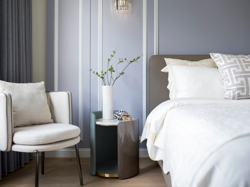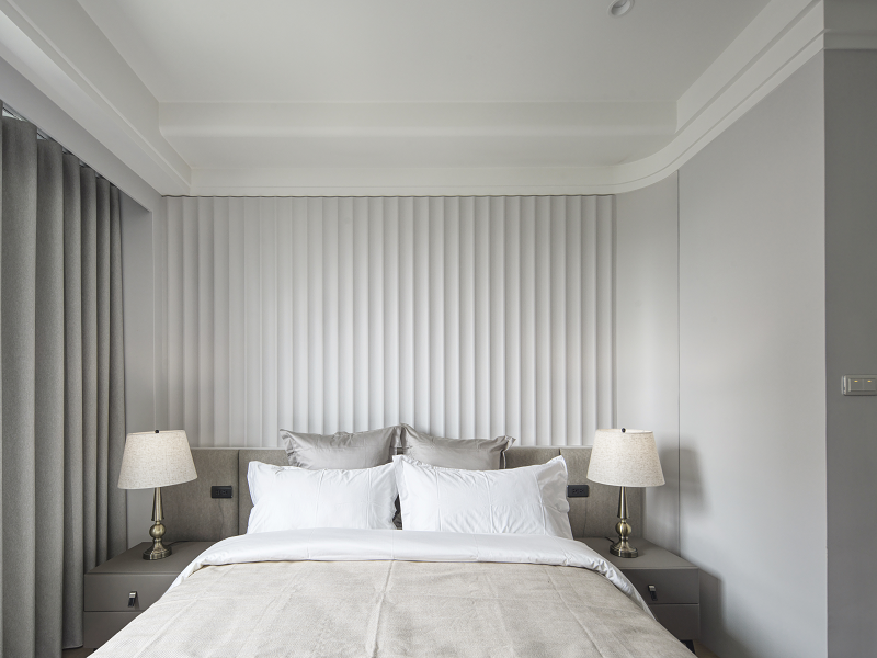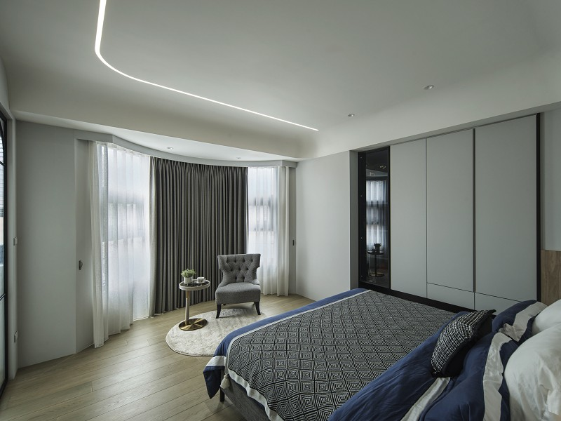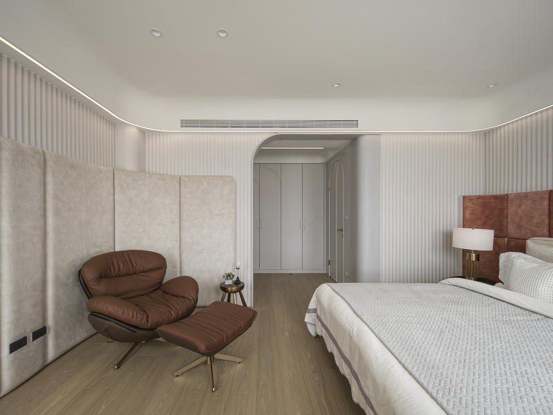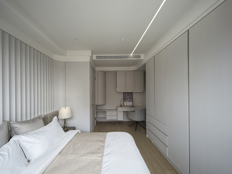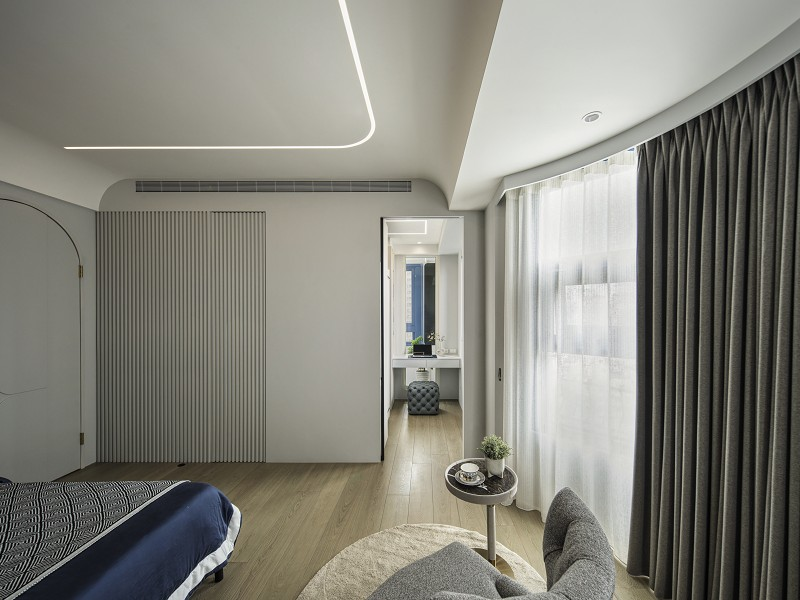 臥室部分延續流動語彙與低彩度色系,加入輕柔的軟裝包覆與隱性收納系統,使生活節奏回歸純粹與靜定。細節如定制弧形書桌、立體圓角門片,皆來自對居住者身體動線與心理安定的細緻觀察。