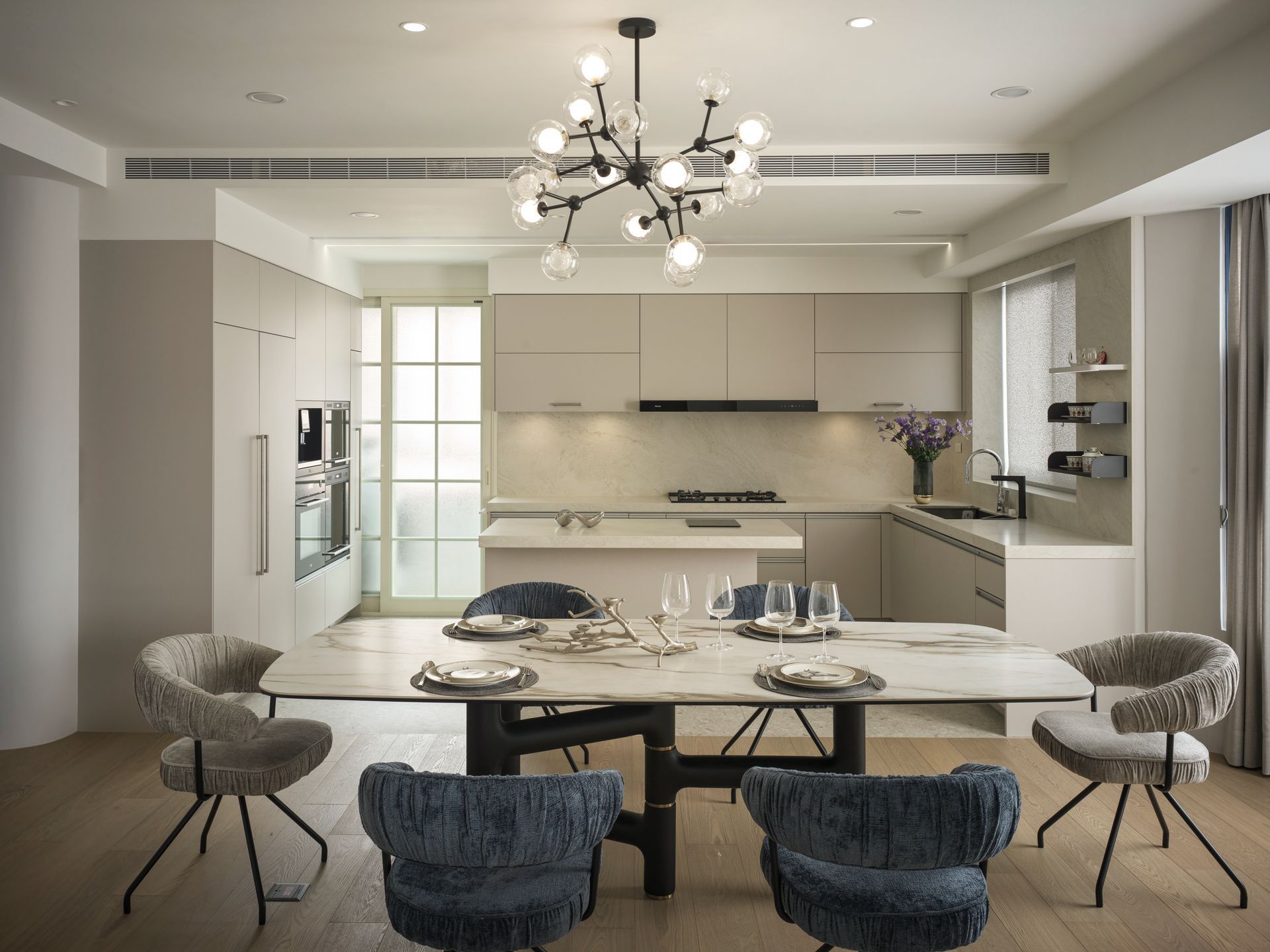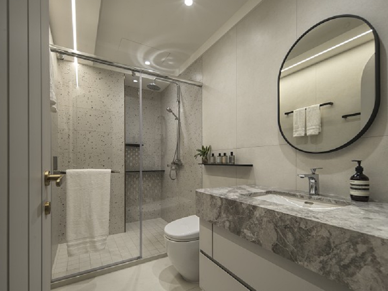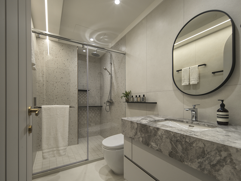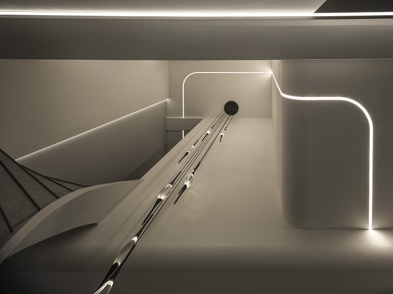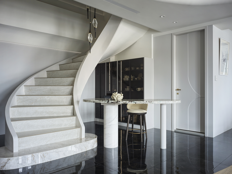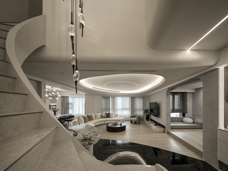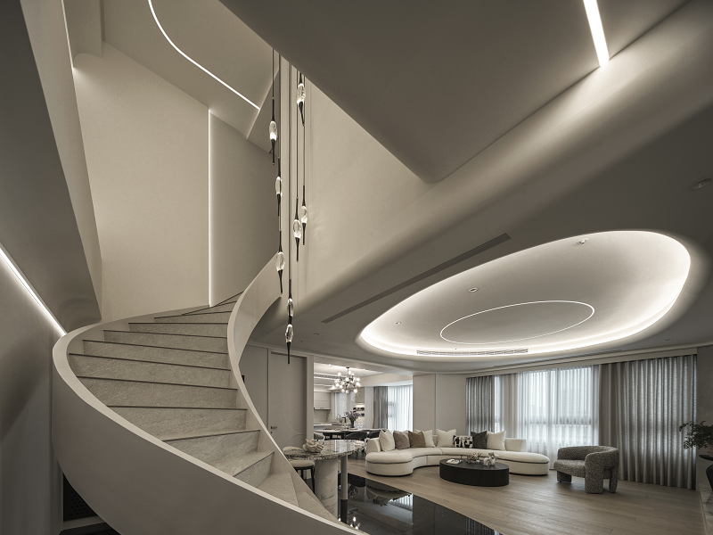 樓梯成為垂直動線中的雕塑焦點,以雲霧般的灰白石材環繞向上延展,與天井吊燈構成空間中的「光軸」與「時間凝結點」,營造仰望的詩意。間接照明內嵌於弧形牆體與天花線條中,形成如晨曦般的柔光輪廓,帶來靜謐卻層次豐富的場域氛圍。
