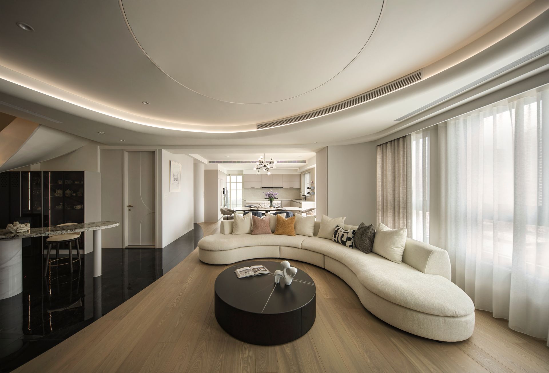 起居空間則以「環形對話」為核心構成概念,沙發、天花圓環與動線環流彼此呼應,強化家庭互動與凝聚的感知體驗。材質上選擇高反光的黑色大理石與溫潤木地板交織鋪陳,象徵著理性與感性、陰與陽的交融。